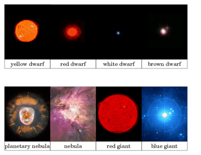 Stars are born in nebulae. The nebula card in this printout has a picture of a nearby nebula and shows baby stars in it. Some of these will become blue giants and others will become yellow dwarfs. When a yellow dwarf gets very old, it becomes a red giant. When a red giant dies, it creates a 'planetary nebula', which will feed new stars that are being created. The center of a planetary nebula is a bright, dense star called a white dwarf. It is tiny and extremely bright because it was the core of the red giant.